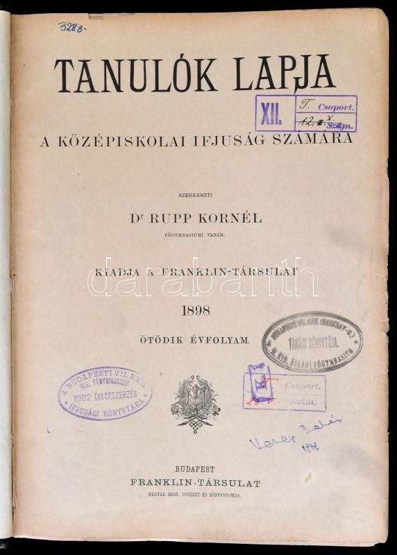 1898 Tanulók lapja. V. évf. 1-52 sz. Szerk.: Dr. Rupp Kornél. Bp., Fra... https://www.darabanth.com/en/336-Online-auction/336.0/Art-and-other-collectibles/Printed-Materials~500030/1898-Tanulok-lapja-V-evf-1-52-sz-Szerk-Dr-Rupp-Kornel-Bp-Franklin-Tarsulat-VIIIplus852-p~II1888219