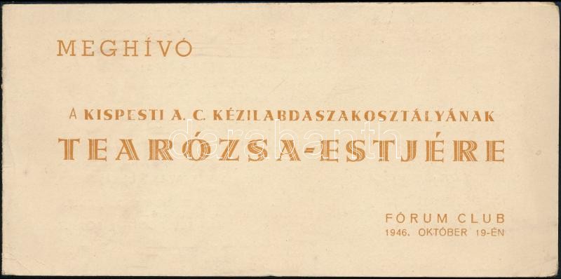 1946 Kispesti A.C. Kézilabdaszakosztályának Tearózsa-estéjének meghívója, Fórum Club, 1946. okt. 19.