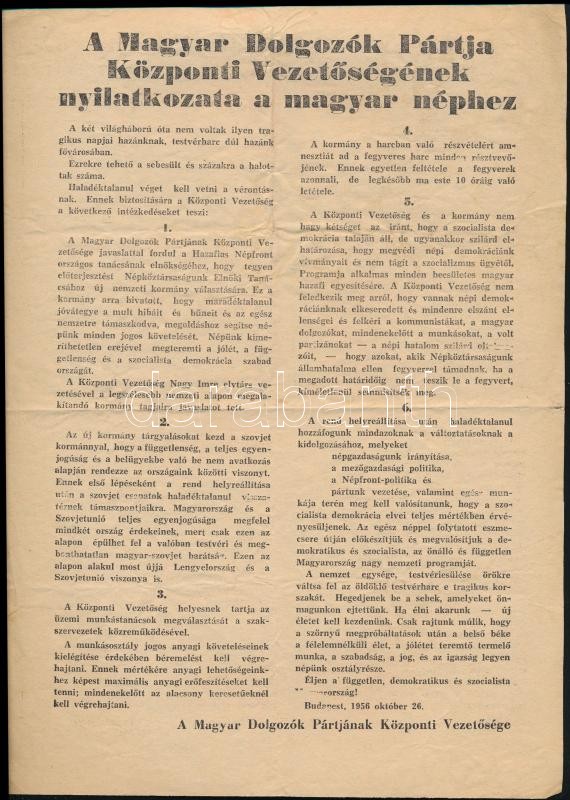 1956 A Magyar Dolgozók Pártja központi vezetőségének nyilatkozata a ma... https://www.darabanth.com/en/336-Online-auction/336.0/Art-and-other-collectibles/Printed-Materials~500030/1956-A-Magyar-Dolgozok-Partja-kozponti-vezetosegenek-nyilatkozata-a-magyar-nephez-1956-okt~II1857006