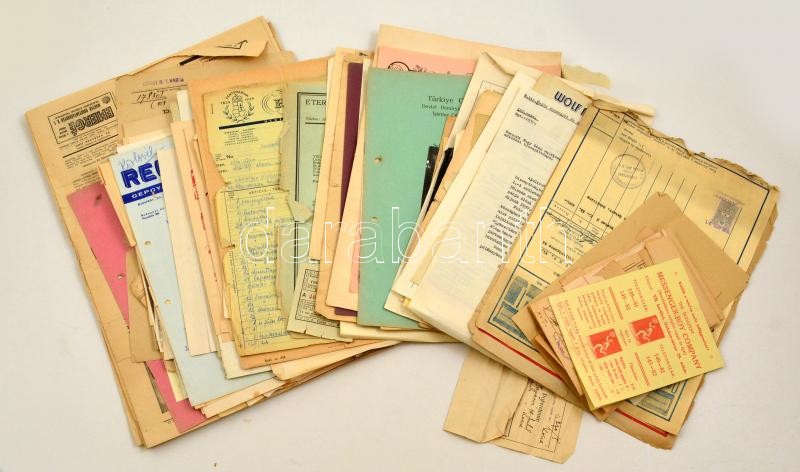 Nagy vegyes nyomtatvány és okmány tétel, közte számlák, reklám nyomtatványok, árjegyzék, italcímke