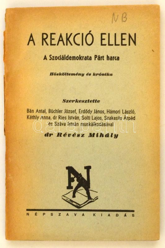 A reakció ellen. A Szociáldemokrata Párt harca. Hősköltemény és krónika. Szerk.: Dr. Révész Mihály. Bán Antal, Büchler József, Erdődy János, Hámori László, Kéthly Anna, Dr. Ries István, Solti Lajos, Szakasits Árpád és Száva István munkálkodásával. Bp.,(1945), Népszava, 159 p. Kiadói papírkötés, szakadt borítóval, sérült, hiányos gerinccel, ceruzás aláhúzásokkal, bejelölésekkel.
