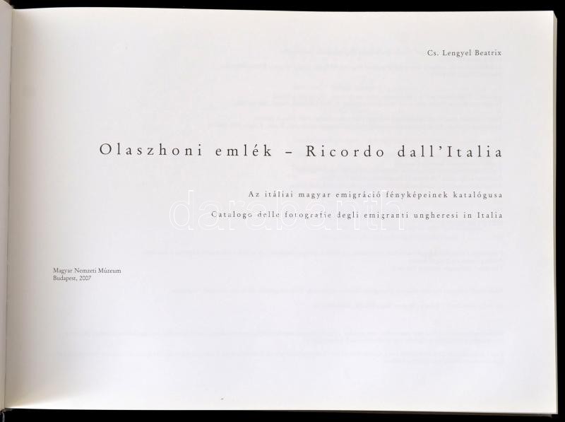 Description: Cs. Lengyel Beatrix: Olaszhoni Emlék. - Ricordo dall"Italia. Az itáliai magyar emigráció fényképeinek katalógusa. Bp.,2007, Magyar Nemzeti Múzeum. Rengeteg fényképpel illusztrált kiadvány. Kiadói kartonált papírkötés.