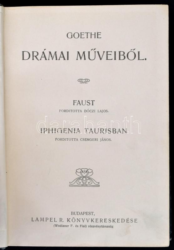 Goethe Drámai Műveiből. Faust. Fordította Dóczi Lajos. Iphigenia Tauri... https://www.darabanth.com/en/336-Online-auction/336.0/Books/Books-Other-rarities~2000018/Goethe-Dramai-Muveibol-Faust-Forditotta-Doczi-Lajos-Iphigenia-Taurisban-Forditotta-Csenger~II1889890
