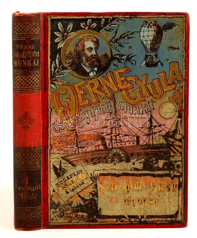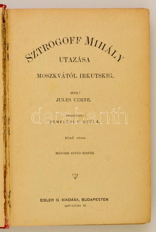 Jules Verne: Sztrogoff Mihály utazása Moszkvától Irkutskig. I-II. rész. (Egyben. A gerincen 1. felirat szerepel.) Ford.: Zempléni P. Gyula. Bp.,é.n., Eisler G.,(Légrády-ny.), 183+1+126+2 p. Második képes kiadás. Kiadói aranyozott, festett, illusztrált egészvászon-kötés, Kiss Valdemár-kötés, márványozott lapélekkel, kopott borítóval, hiányzó elülső előzéklappal, kissé laza, javított kötéssel.