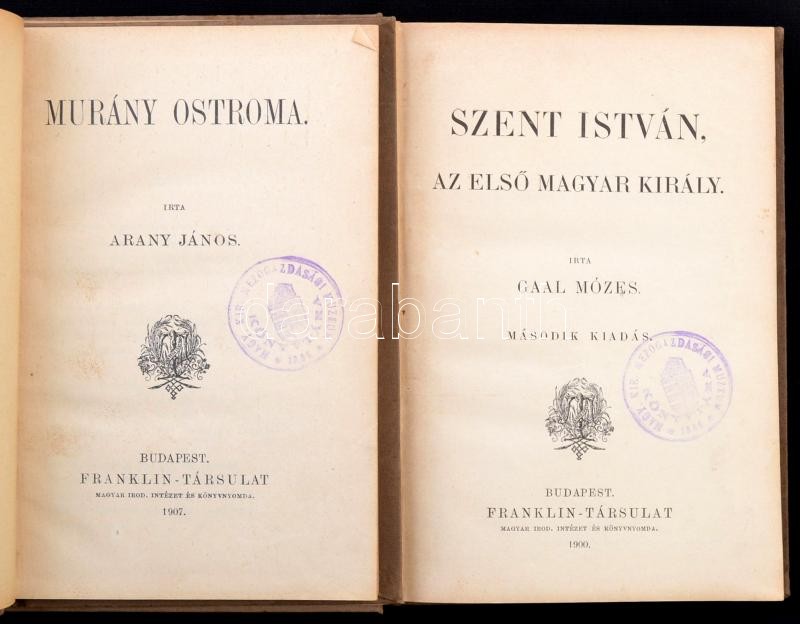 Vegyes könyvtétel, 2 db: Gaál Mózes: Szent István. Az első magyar király. Bp., 1900, Franklin. Második kiadás. Átkötött egészvászon-kötés, intézményi bélyegzővel, kopottas, foltos borítóval. Arany János: Murány ostroma. Bp.,1907, Franklin. Átkötött egészvászon-kötés, intézményi bélyegzővel, kopottas, foltos borítóval.