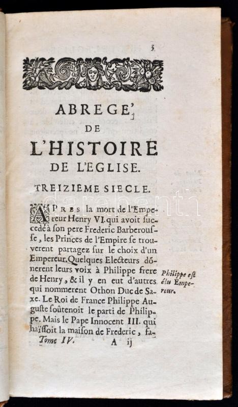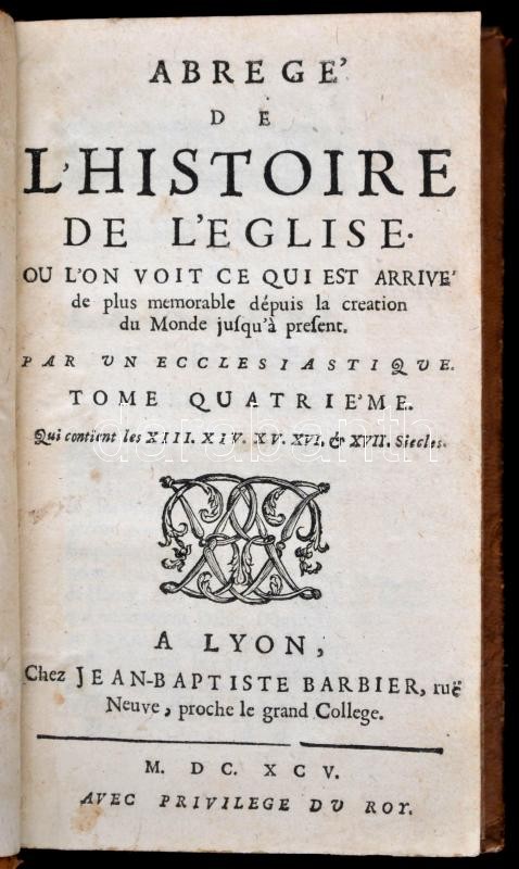 Abrégé de l'histoire de l'église. Tome Quatriéme. Lyon, 1695, Jean-Babtiste Barbier, 403+33 p. Francia nyelven. Korabeli aranyozott, álbordás egészbőr-kötésben, kopott borítóval, a borítón apró sérüléssel, a gerincen sérüléssel, kissé foltos lapokkal.