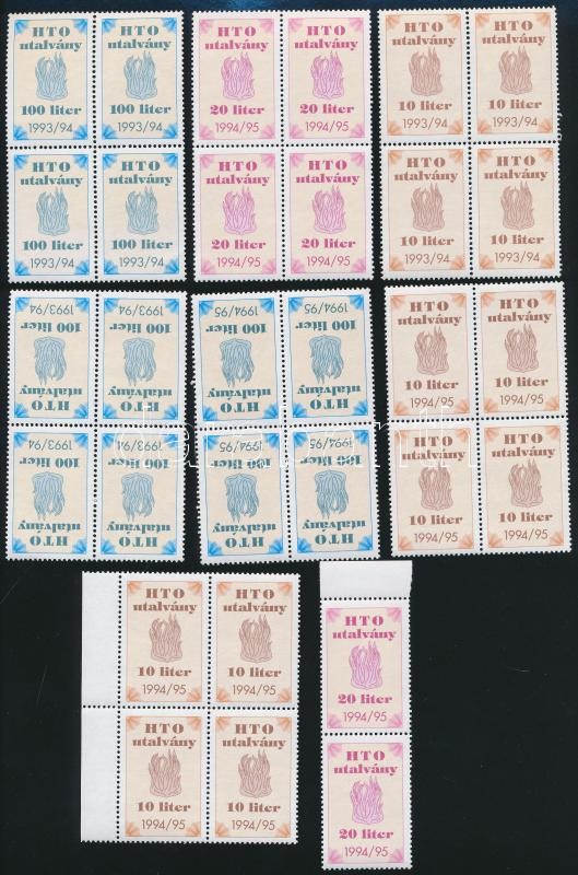 1993-1994. "HTO (Háztartási Tüzelőolaj) utalvány - 10 liter" (12x) összefüggésekben, közte ívszéli darabok + "HTO (Háztartási Tüzelőolaj) utalvány - 20 liter" (6x) összefüggésekben + "HTO (Háztartási Tüzelőolaj) utalvány - 100 liter" (12x) összefüggésekben T:I,I-