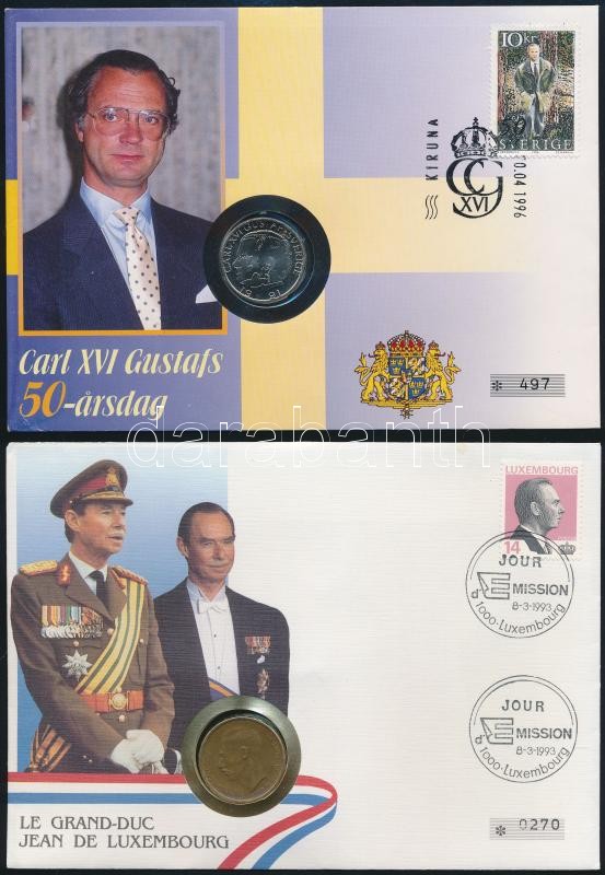 6db-os érmés boríték tétel uralkodói évfordulók alkalmából kiadva, benne belga (2x), spanyol, luxemburgi, svéd és jersey-i kiadások T:1,1-