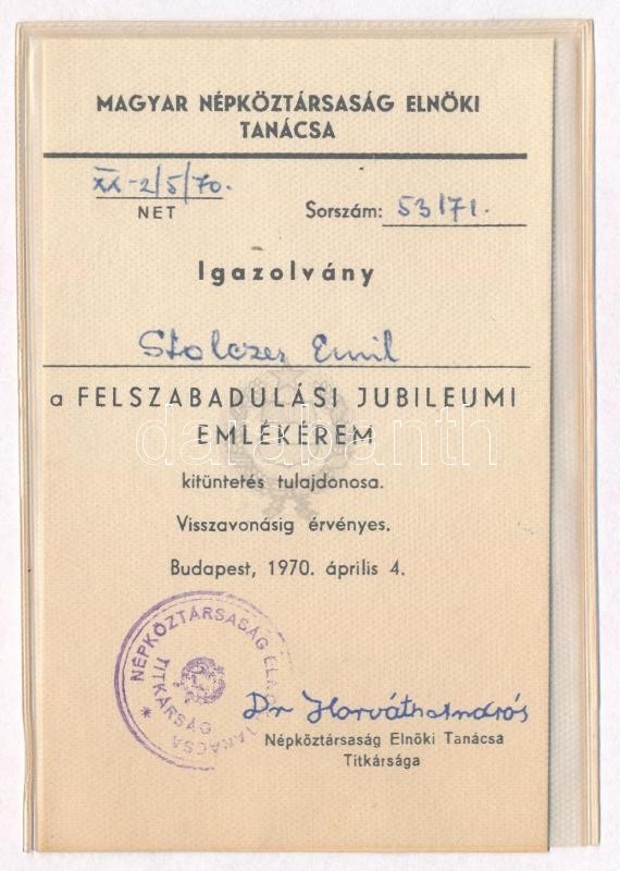 1970. "Felszabadulási Jubileumi Emlékérem" adományozói okira...