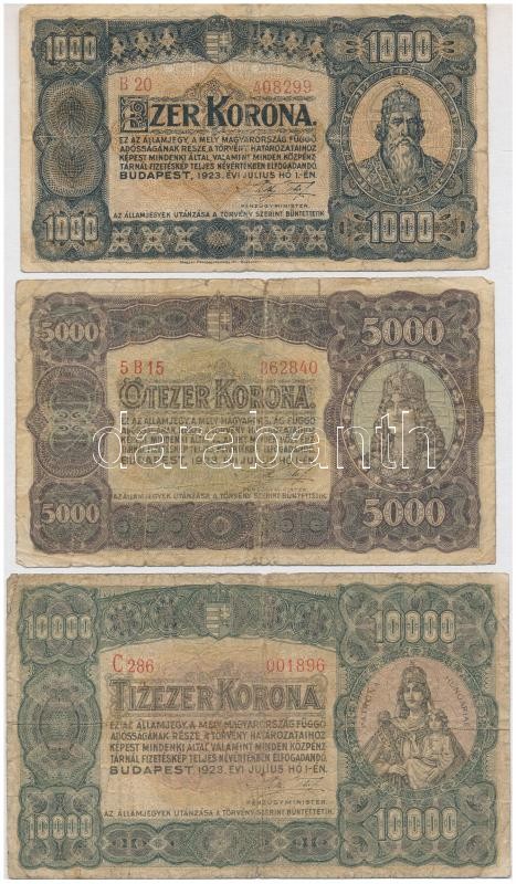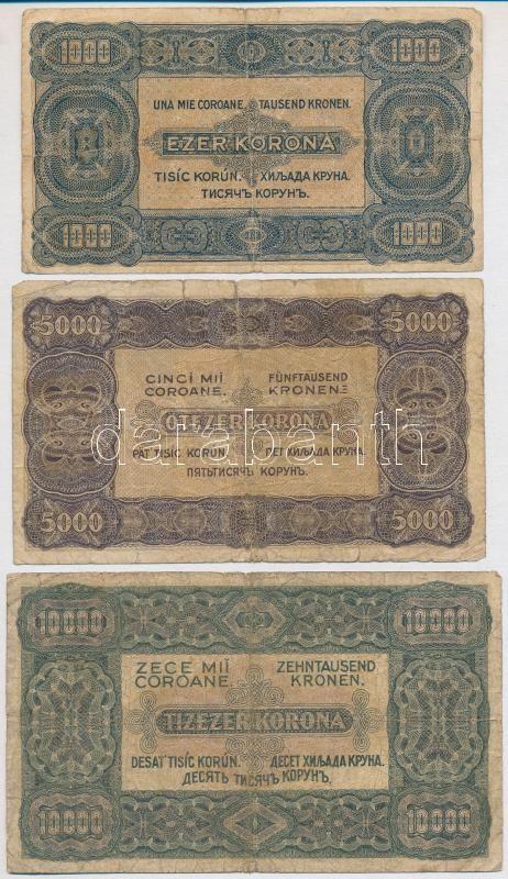 1923. 1000K "Magyar Pénzjegynyomda R.t. Budapest" nyomdahely jelöléssel + 1923. 5000K nyomdahely nélkül, "T.W." jelöléssel + 1923. 10.000K nyomdahely jelölés nélkül T:III-
