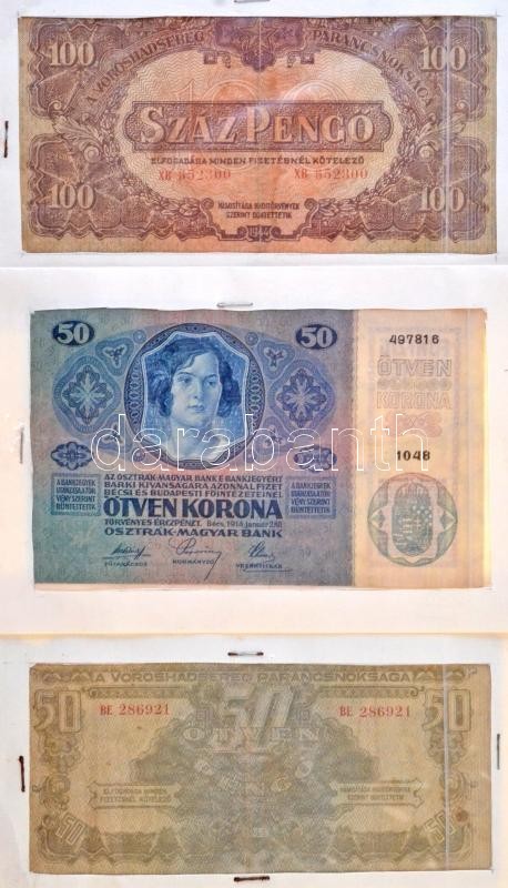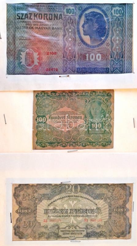 Description: Vegyes 12db-os korona és pengő bankjegy tétel, valamint egy "Centenáriumi Fradi Forint", mind lezárt ablakos papírtokban, a bankjegyek nagy része tűzőgép kapoccsal lyukasztva T:III ly.