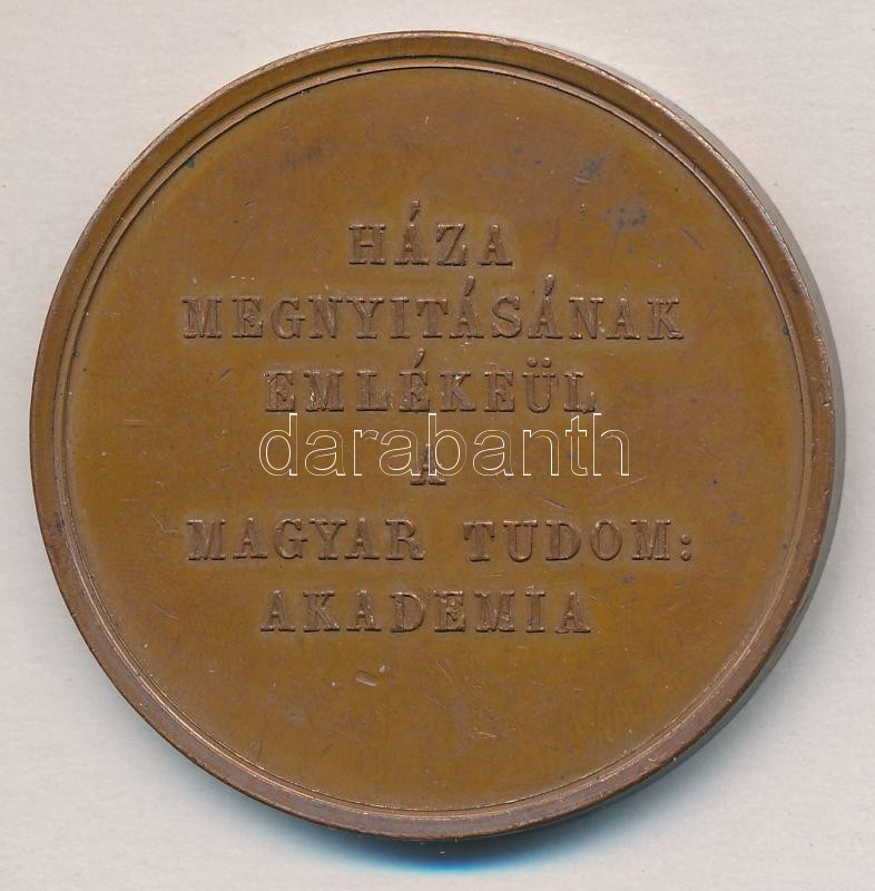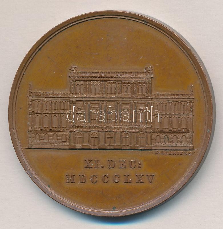 Description: Carl Radnitzky (1818-1901) 1865. "A Magyar Tudományos Akadémia megnyitásának 40. évfordulójára" Br emlékérem. "XI. DEC: MDCCCLXV / HÁZA MEGNYITÁSÁNAK EMLÉKEÜL A MAGYAR TUDOM: AKADÉMIA" (54,41g/51mm) T:1-,2
