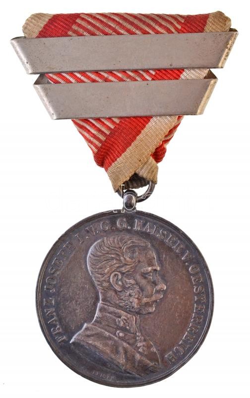 Description: 1914. "Ferenc József I. osztályú Ezüst Vitézségi Érem, harmadszori adományozás" peremén jelzett Ag kitüntetés eredeti mellszalagon, ismétlőpánttal. Szign.: Leisek T:2