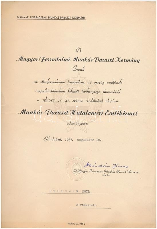 1957. "Munkás-Paraszt Hatalomért Emlékérem" adományozói okir...