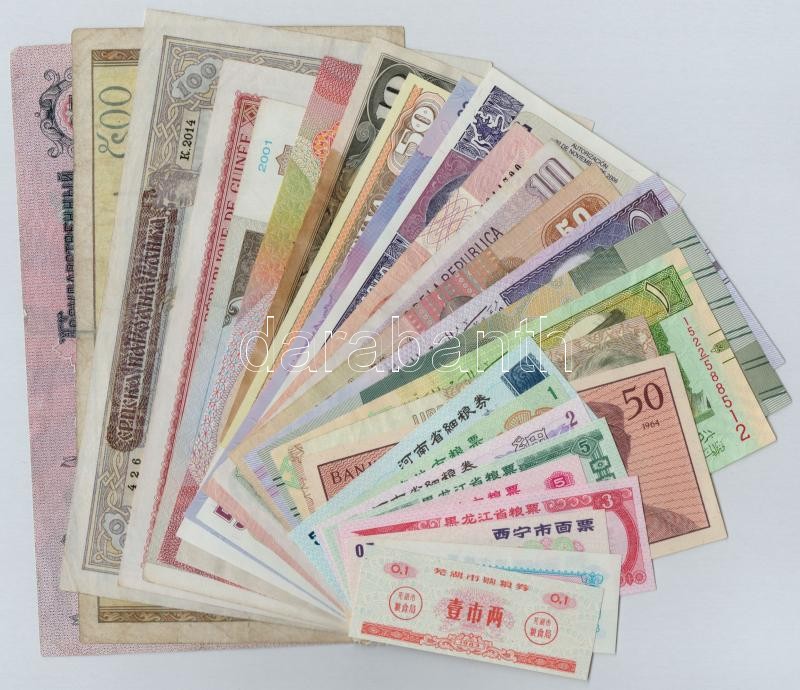 28db-os vegyes bankjegy tétel, közte MaldÃv-szigetek, Litvánia, Fülöp-szigetek / Japán megszállás, Kolumbia, Indonézia, Üzbegisztán, Olaszország, Guatemala, Egyiptom, Bahrein, Kambodzsa és kÃnai rizs(?)jegyek T:vegyes 28pcs of various banknotes, including Maldives, Lithuania, Philippines / Japan occupation, Colombia, Indonesia, Uzbekistan, Italy, Guatemala, Egypt, Bahrain, Cambodia and Chinese rice(?)coupons C:mixed