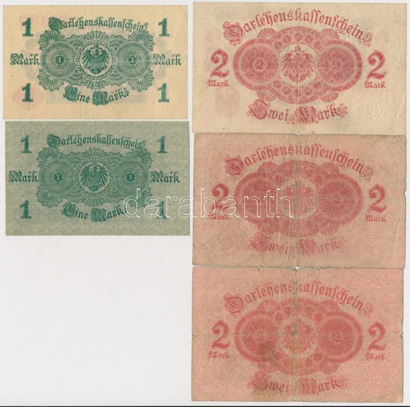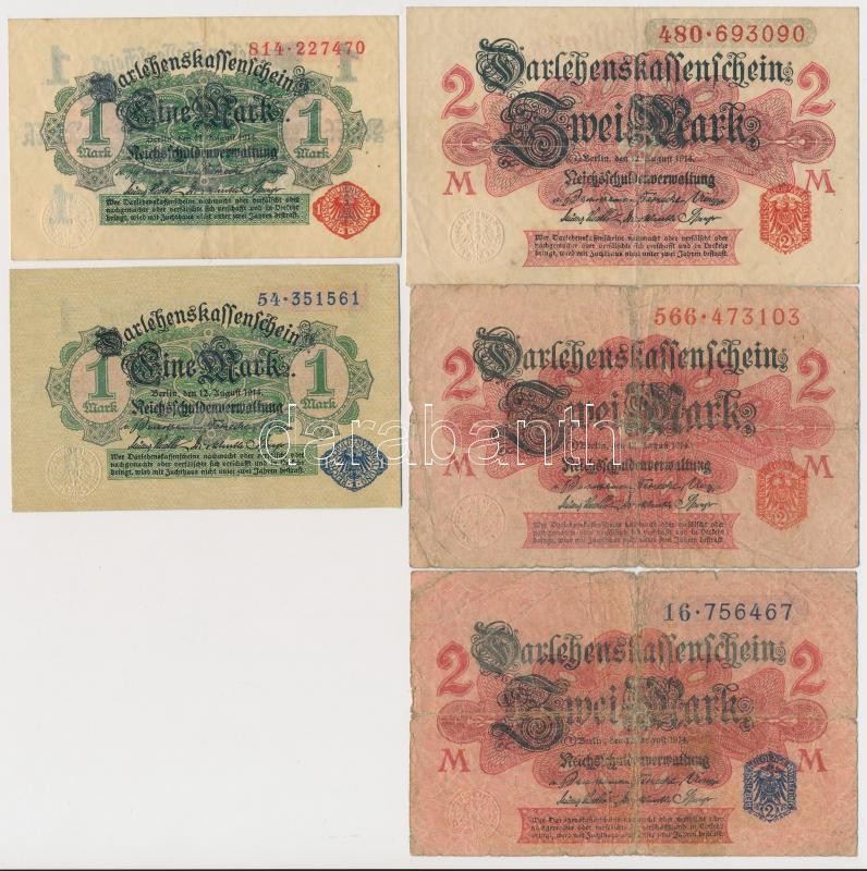 Német Birodalom 1914. 1M piros sorszám és címer + 1920. 1M kék sorszám és címer + 1914. 2M piros sorszám és címer, fehér papír + 2M piros sorszám és címer + 2M kék sorszám és címer T:II-III-
