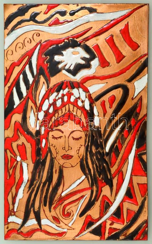 Jelzés nélkül: Indiánlány, tűzzománc, fém, kis kopásokkal, 30×18,5 cm