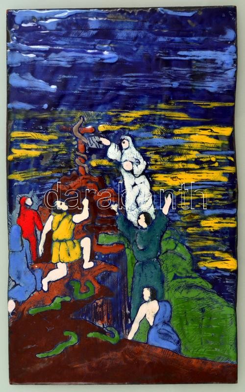 Jelzés nélkül: Kígyóbűvölő, tűzzománc, fém, kis kopásokkal, 25,5×15 cm