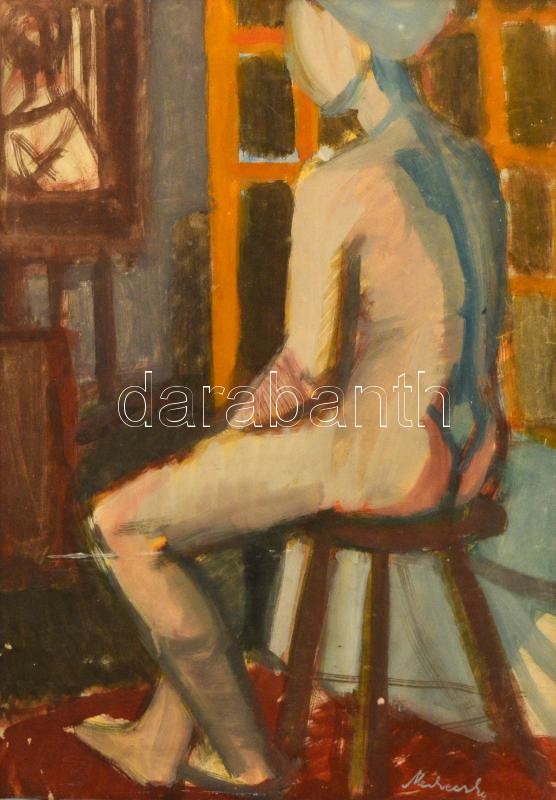 Medveczky jelzéssel: Ülő akt. Tempera, papír, foltos, üvegezett sérült keretben, 50×35 cm