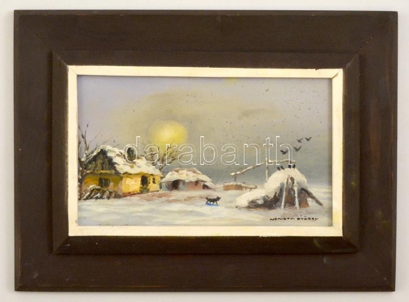 Németh jelzéssel: Téli tanya. Olaj,farost, foltos, keretben, 15×25 cm