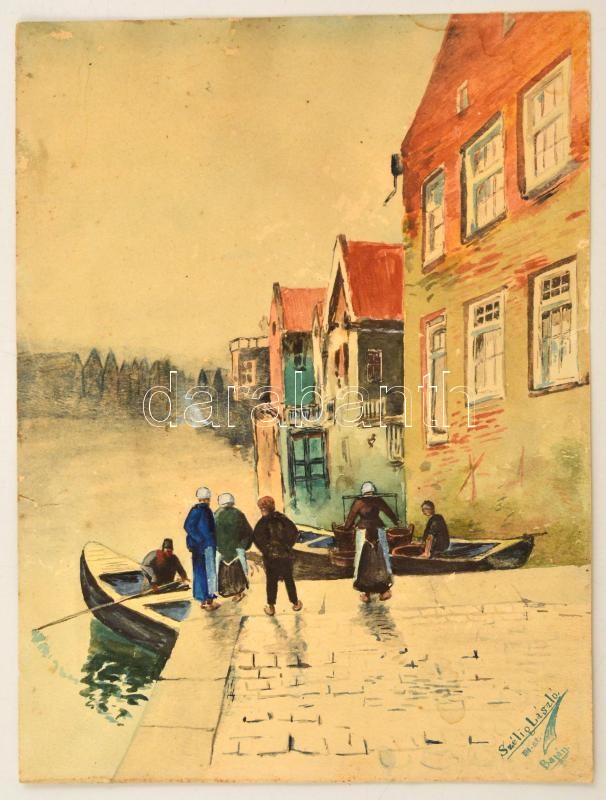 Szélig László (?-?): Csónakosok. Akvarell, papír, 28×20 cm