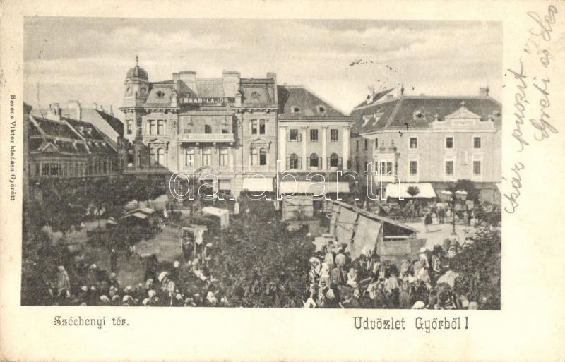 1904 Győr, Széchenyi tér, piac, Raab Lajos és Cohn Móricz és Társa üzl...