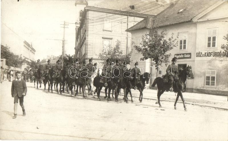 Description: 1921 Sopron, Ostenburg különítmény (csendőrzászlóalj) díszfelvonulása augusztus 29-én délelőtt 9 órakor (Sopron város Ausztriának (Burgenland tartomány) történő hivatalos átadásának napja). A nyugat-magyarországi felkelés előnapja. Mayerhoffer Aladár üzlete és Gőz és kádfürdő. Schäffer Ármin photo