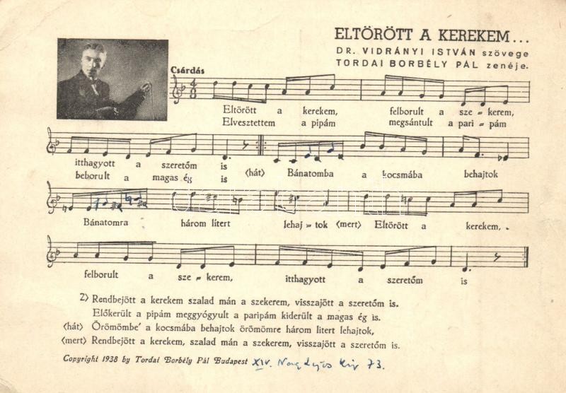 Eltörött a kerekem... Dr. Vidrányi István szövege és Tordai Borbély Pál zenéje. Kottás lap / Hungarian music sheet (EK)