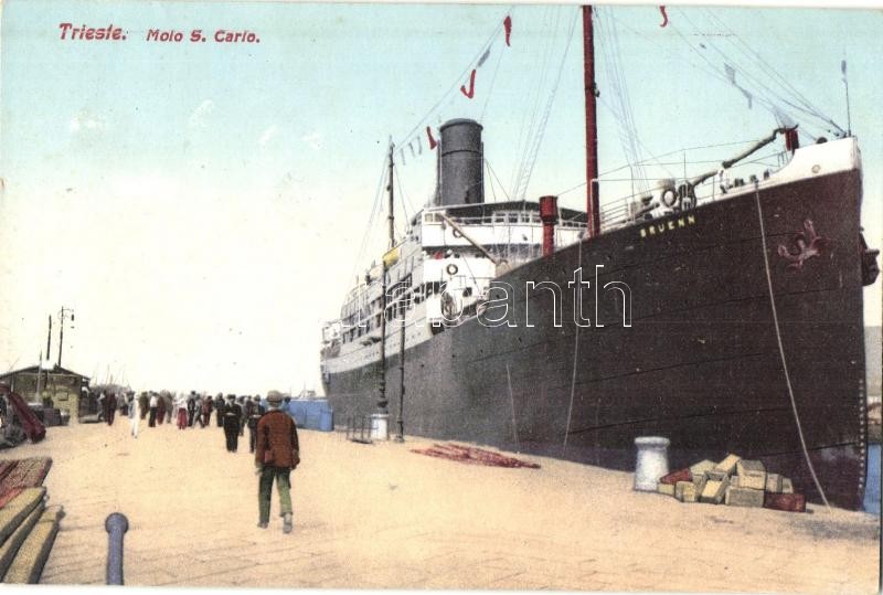 Description: Lloyd Austriaco Bruenn gőzhajója Trieste kikötőjében (a háború alatt csapatszállító hajóként szolgált). Milan Mandich Nr. 732. / Bruenn passenger ship of the Austrian Lloyd steamship company in the port of Trieste (served as a K.u.K. Kriegsmarine trooper, squadron ship during the WWI)