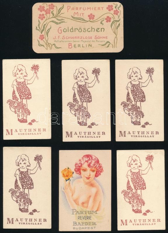 cca 1920-1940 7 db illat kártya, közte: Mauthner virágillat (5 db), Bp... https://www.darabanth.com/en/337-Online-auction/337.0/Art-and-other-collectibles/Advertisement~500021/cca-1920-1940-7-db-illat-kartya-kozte-Mauthner-viragillat-5-db-Bp-Baeder-Parfum-Reverie-B~II1892416