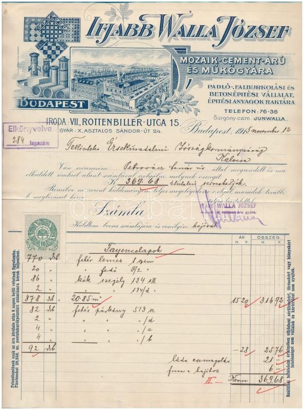 1915 Bp., Ifjabb Walla József Mozaik-Cement-Áru és Műkőgyára dekoratív... https://www.darabanth.com/en/337-Online-auction/337.0/Art-and-other-collectibles/Documents~500017/1915-Bp-Ifjabb-Walla-Jozsef-Mozaik-Cement-Aru-es-Mukogyara-dekorativ-fejleces-szamlaja-~II1892266