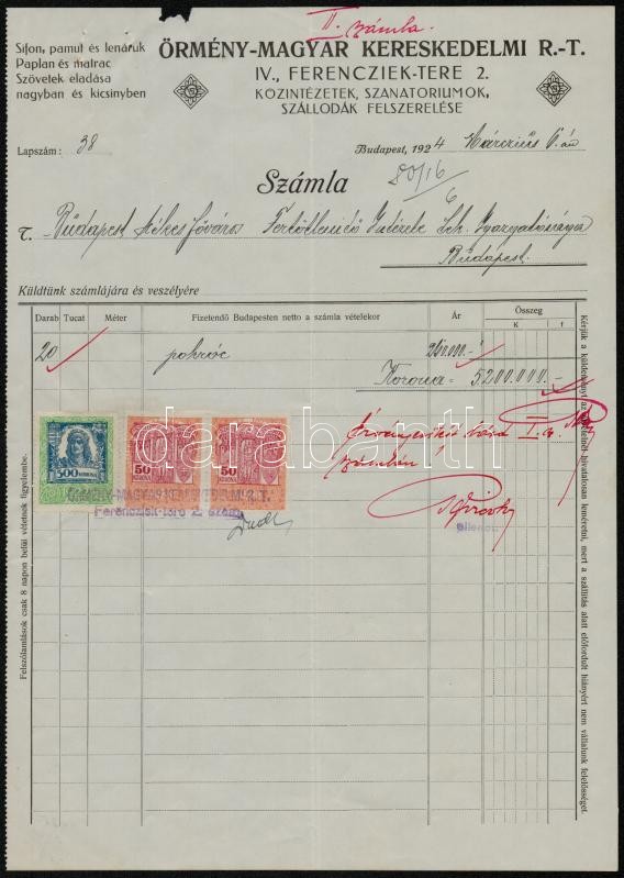 1924 Örmény-Magyar Kereskedelmi Rt. fejléces számla, okmánybélyegekkel
