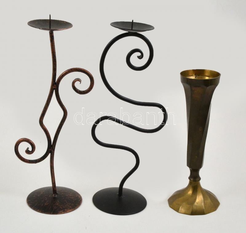2 kovácsoltvas gyertyatartó 28 cm + 1 réz váza.