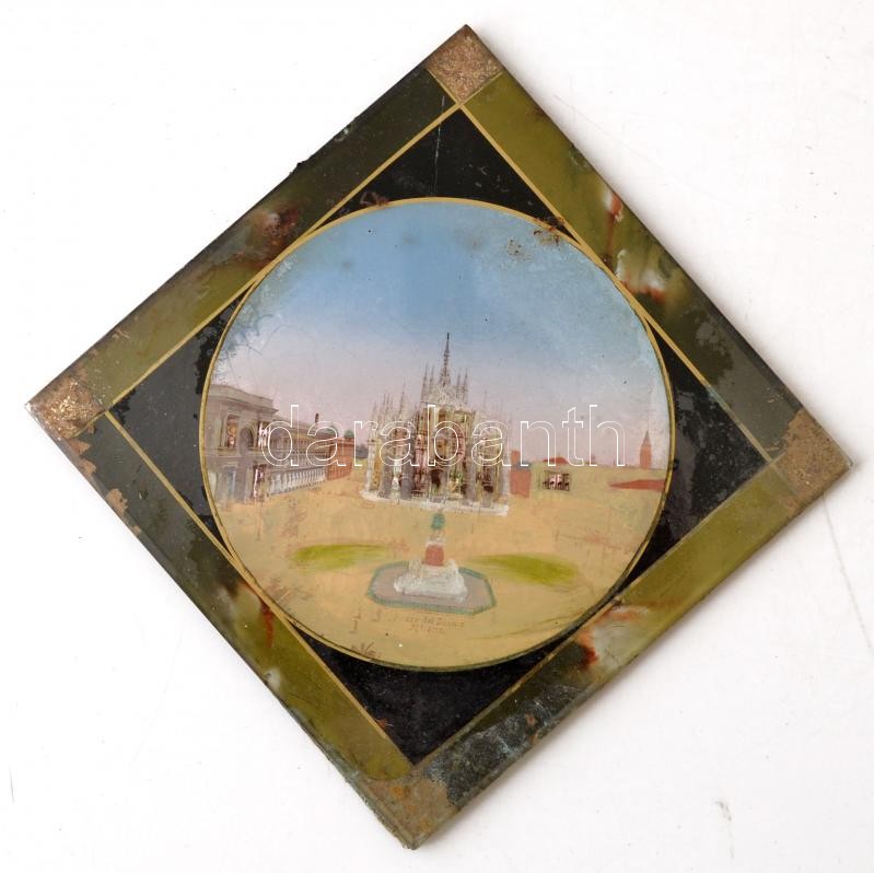Milánó, régi üvegkép, sérülésekkel, 12×12 cm