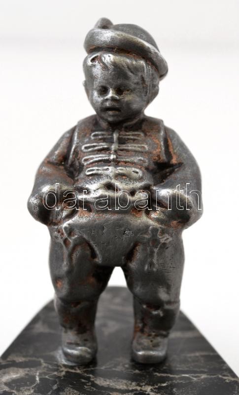 Zsebre dugott kezű, népviseletes spiáter kisfiú szoborka, alabástrom talapzaton, a talapzat alján a csavar körül sérüléssel, figura: 9 cm, 14x9 cm