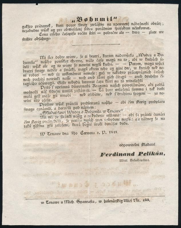 1848 Nagyszombat, Pelikán Ferdinánd (1814-1864): a nagyszombati papnevelő intézet tanárának, Szabadság, egyenlőség, és testvériség! (Sloboda, práwurownost, a braterstwo!) sorokkal kezdődő szlovák nyelvű röpirata. Nagyszombat, M. Spanrast-ny., 2 p. / 1848 Trnava, Ferdinand Pelikán (1814-1864): Pamphlet from 1848, with Freedom, equality, and fraternity! (Sloboda, práwurownost, a braterstwo!) starting writings, in Slovakian language. Trnava, M. Spanrast, 2 p.