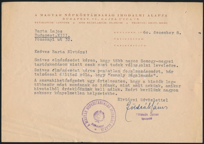 Description: 1960 Földeák János (1910-1997) József Attila-díjas író, költő, Magyar Népköztársaság Irodalmi Alapjának igazgatójának (1960-1970) gépelt levele Barta Lajos (1878-1964) író részére, benne bocsánatkéréssel a "pontatlan" fogalmazásért, Földeák János aláírásával, fejléces papíron
