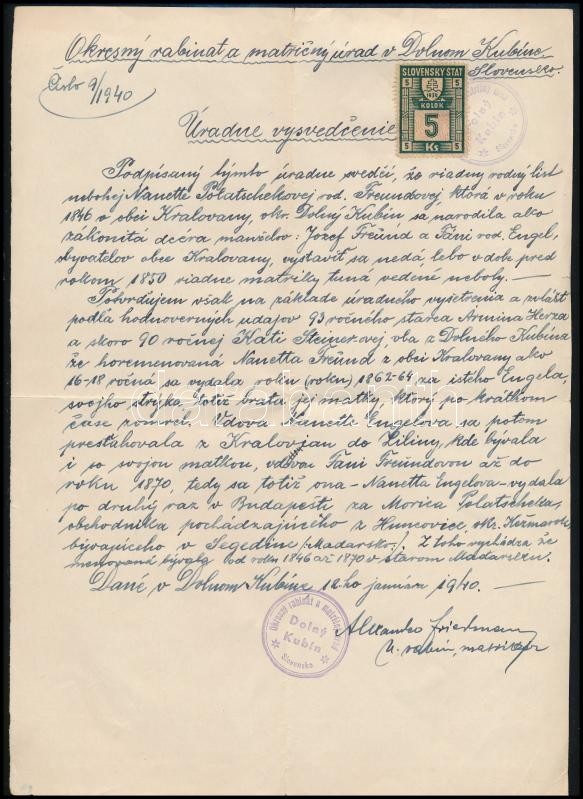 Description: 1940 Alsókubini rabbinátus anyakönyi hivatalának igazolása, Alexander Friedmann rabbi aláírásával, szlovák nyelven, pecséttel, okmánybélyeggel./