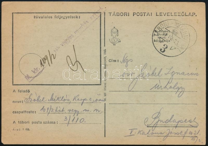 1941 Munkás század tagjának tábori levelezőlapja, m. kir. 109/2 táb. v...