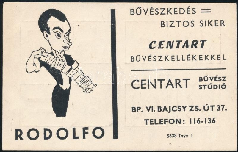 cca 1940 "A bűvészkedés = biztos siker Centart bűvészkellékkel" - Centart Bűvész Stúdió reklámkártyája, rajta Rodolfo-val,7x11 cm
