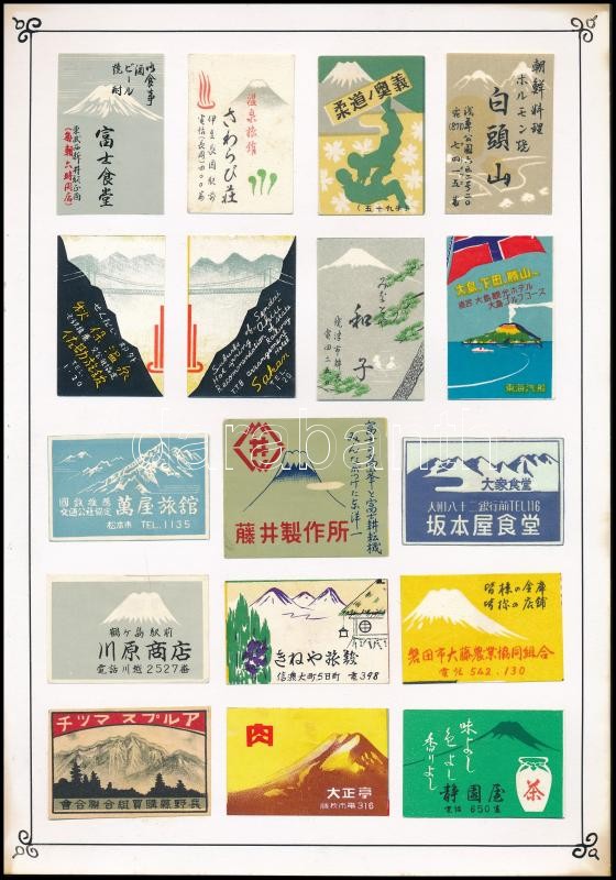 cca 1950 132 db japán gyufacímke, 7 db kartonlapra ragasztva
