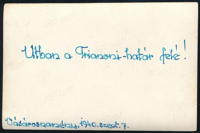 1940 Katonai szállítóvonat a vásárosnaményi pályaudvaron, útban a trianoni határ felé, hátoldalon feliratozott fotó, 7,5×12 cm