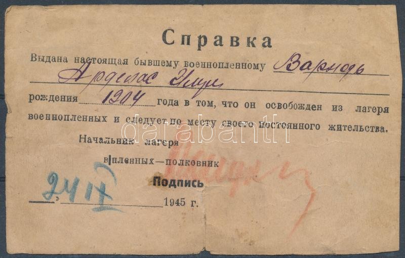https://www.darabanth.com/en/337-Online-auction/337.0/Art-and-other-collectibles/Military~500027/1945-Orosz-szabadulo-igazolvany-Russian-POW-freeing-document~II1893649