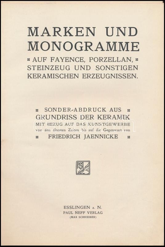 Jaennicke, Friedrich: Marken und Monogramme, auf Fayence, Porzellan, Steinzeug und Sonstigen Keramischen Erzeugnissen. Esslingen a. N.,(1878), Paul Neff Verlag (Max Schreiber.), XV+95 p. Német nyelven. Korabeli aranyozott egészvászon-kötésben, kopott gerinccel, 8 lap kijár./Half-linen-binding, 8 pages coming out, in German language.