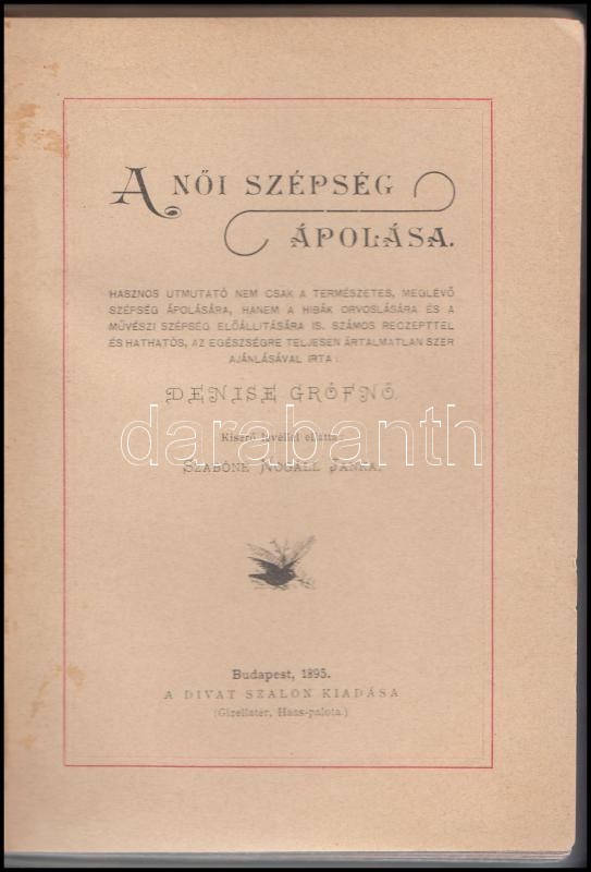 Denise grófnő: A női szépség ápolása. Szabóné Nogáll Janka kísérőlevel... https://www.darabanth.com/en/337-Online-auction/337.0/Books/Books-Other-rarities~1000018/Denise-grofno-A-noi-szepseg-apolasa-Szabone-Nogall-Janka-kiserolevelevel-Bp-1895-~II1855957