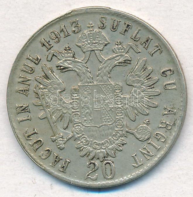 https://www.darabanth.com/en/337-Online-auction/337.0/Numismatics/Emergency-Coins-and-Notes~1500007/1913-20kr-Veretett-1913-evben-ezustozott-fem-jatekpenz-magyar-es-roman-felirattal-T2-~II1889672