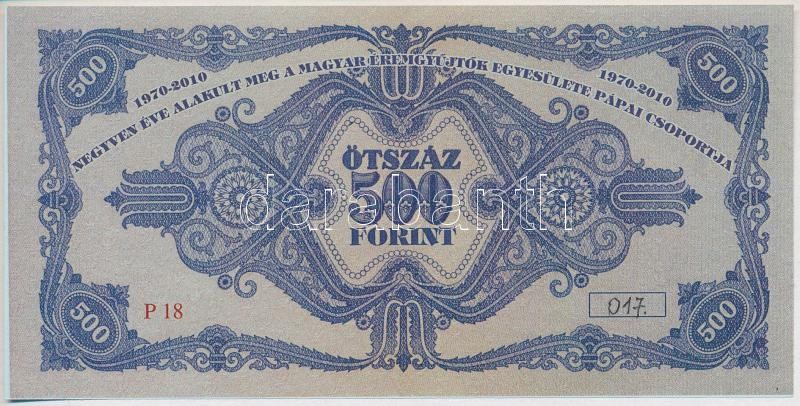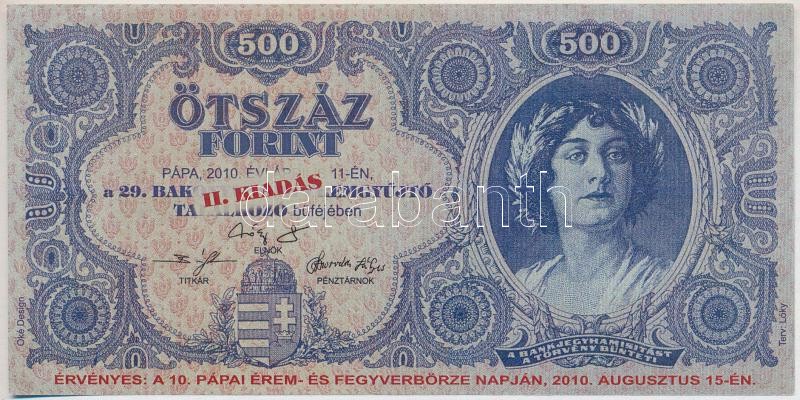 Description: Pápa 2010. "MÉE Pápai csoport / 29. Bakonyvidéki Éremgyűjtő találkozó" 500Ft alkalmi pénz, "II. kiadás / Érvényes: 10. Pápai Érem és Fegyverbörze napján, 2010. augusztus 15-én" felülbélyegzéssel, "P18-017" T:I