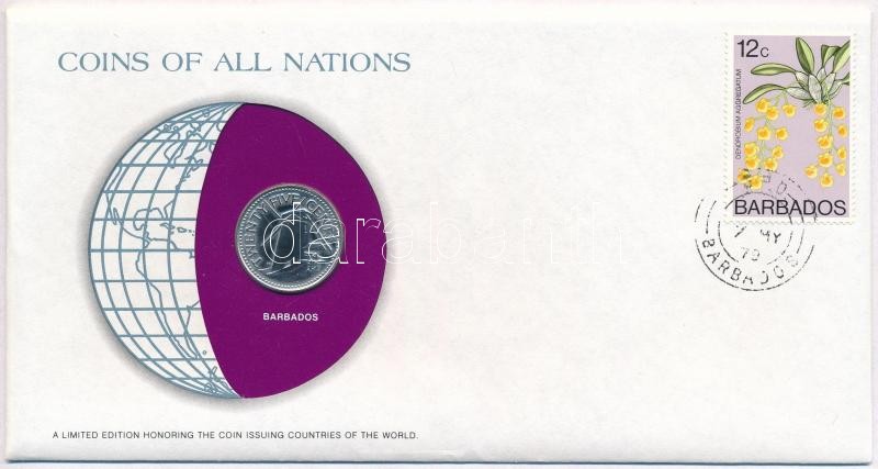 Description: Barbados 1979. 25c "Nemzetek pénzérméi" felbélyegzett borítékban, bélyegzéssel, holland nyelvű leírással T:1