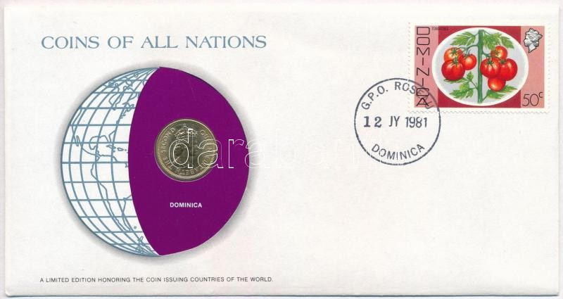 Description: Dominika 1965. 5c "Nemzetek pénzérméi" felbélyegzett borítékban, bélyegzéssel, holland nyelvű leírással T:1-