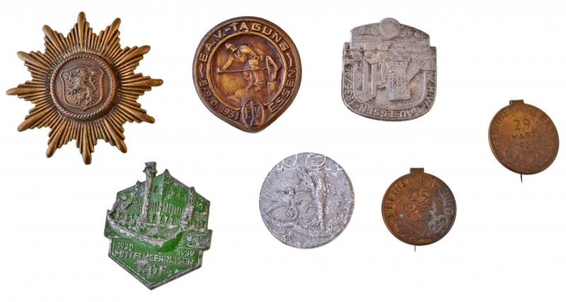 Description: 7db német jelvény és kitűző, közte 1936. "Freiheit und Brot - 29. Marz 1936" fém kitűző (28mm) T:2-3